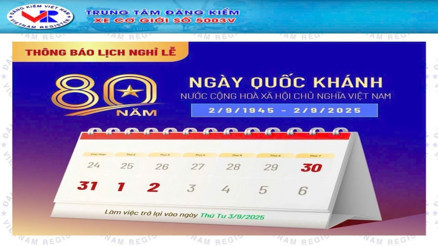 Nhân dịp kỉ niệm Quốc khánh 2/9, Trung tâm đăng kiểm số 50-03V xin trân trọng thông báo tới toàn thể cán bộ, người lao động, cùng quý khách hàng về việc nghỉ lễ như sau:
